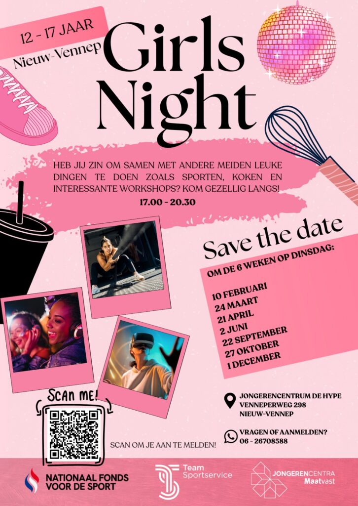 Samen met andere meiden ga je sporten, koken en meedoen aan inspirerende workshops. Het wordt een avond om niet te missen – gezellig, creatief en helemaal jouw vibe!